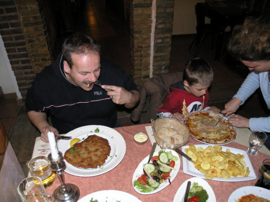 Martin beim "Einlösen" der Wette, Schnitzel Hans vor sich...
